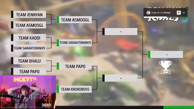 03:49:14Nach Abschluss der Gruppenphase werden die vier verbliebenen Teams analysiert. Der Streamer sieht das Team von Krokos als den Turnierfavoriten, da es sehr stark und rund sei. Dabei wird die außergewöhnliche Leistung von Kroko selbst hervorgehoben, der als High-Elo-Spieler innerhalb kürzester Zeit von Silber 1 auf A3 aufgestiegen ist und als "Kitzelmonster" im Turnier für Furore sorgt. Das Team gilt als der klare Favorit.