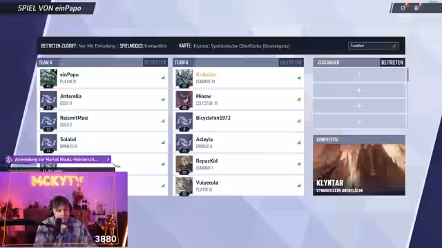 03:48:45Das Team von Kroko wird als Turnierfavorit gehandelt, da es als sehr stark und ausgewogen gilt. Krokos Engagement wird besonders hervorgehoben, da er intensiv trainiert und sich vom Silber- zum A3-Spieler hochgearbeitet hat. Es wird überlegt, Watchpartys zu veranstalten oder die Spiele selbst zu kommentieren und anzusehen, wobei die Teamkapitäne in der Freundesliste zur Verfügung stehen. Die erste Map für das Halbfinale wird Klintar sein, die symbiotische Oberfläche, und der Verlierer kann die nächste Map auswählen. Es wird kurz diskutiert, ob Freddy von der Ratte (Raccoon) weggenommen werden kann, aber dies wird verneint. Es wird über die Stärken und Schwächen des Gegners gesprochen, insbesondere über Freddy und Raccoon, gegen die es schwerfällt, Luft zu bekommen. Star-Lord wird als möglicher Charakterwechsel in Betracht gezogen. Es wird angedeutet, dass dies das schwierigste Match sein wird und dass alle verfügbaren Mittel eingesetzt werden müssen, um zu gewinnen. Es wird festgestellt, dass der Gegner jeden Vorteil nutzt und dass Level 4 Freddy ein Endgegner ist.