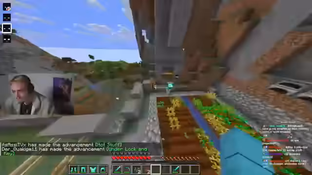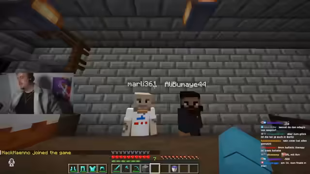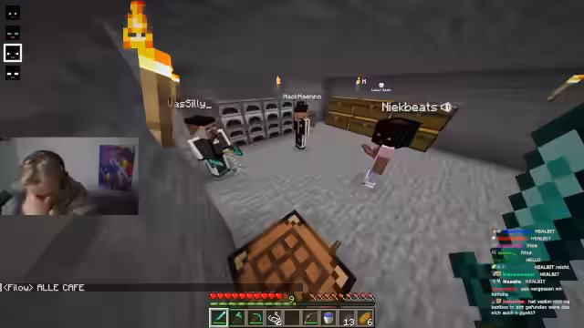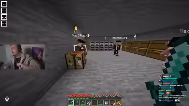 01:38:06Nach einem turbulenten Einsatz, der in einem 'dritten Weltkrieg' gipfelte, führt die Gruppe eine Nachbesprechung durch. Man bespricht den fehlgeschlagenen Angriff auf Robert, bei dem dessen starke Verzauberungen den Sieg verhinderten. Zudem werden Pläne für den Aufbau einer Villager-Farm diskutiert, die im Austausch für ein 'Free Respin' am Rad der Qualen versprochen wurde. Der Streamer kündigt an, dass die Gruppe nach der Besprechung die zentrale Mission des Tages – das Drehen des Rades – erfüllen muss.