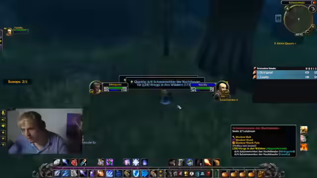 06:21:49Während des Dungeons wird eine Escort-Quest gestartet. Es wird der Spielespieler angewiesen, eng bei dem NPC zu bleiben. Gleichzeitig wird eine weitere Quest aktiviert, bei der mit "Schnüffel"-Objekten bestimmte Tiere gefunden werden müssen. Dabei kommt es zu erheblichen Schwierigkeiten und Missverständnissen, was zu vielen gescheiterten Versuchen und Frustration im Chat führt.