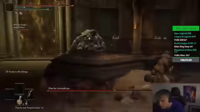 00:24:31Der Streamer befindet sich mitten im Kampf gegen den ersten Boss. Er muss noch drei Level in seinem 'Glaube'-Attribut erreichen, was den Kampf erheblich erleichtern würde. Er arbeitet mit seinem Mitspieler zusammen, der als Tank fungiert, und sie versuchen gemeinsam, den Boss zu besiegen. Der Streamer beschreibt die Aktionen des Bosses und seine eigenen Reaktionen darauf, einschließlich Aggro-Switches und Phasenwechsel. Es gibt technische Probleme mit der Lautstärke, die der Streamer sofort anpasst.