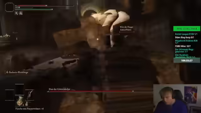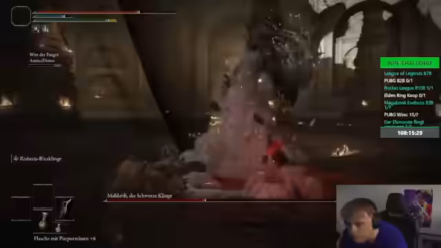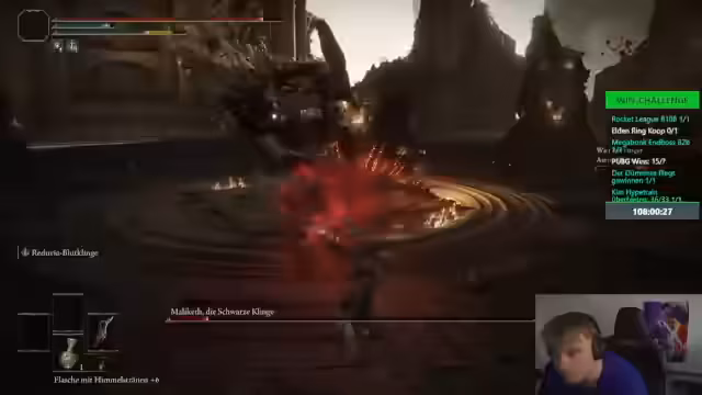00:04:38Der Stream beginnt mit Begrüßungen des Chats. Der Streamer kündigt an, dass der Rhinos-Dreh erst am nächsten Tag stattfindet und er stattdessen Elden Ring spielen wird. Er erwähnt, dass er seit dem letzten Format nicht geschlafen hat und nur noch acht und halb Zeit hat, um das Spiel durchzuspielen. Er beschreibt den schweren Weg durch das Spiel und seine Erschöpfung. Der Streamer startet das Spiel und beginnt mit dem Bosskampf, wobei er strategische Überlegungen anstellt und sich auf den ersten Boss konzentriert.