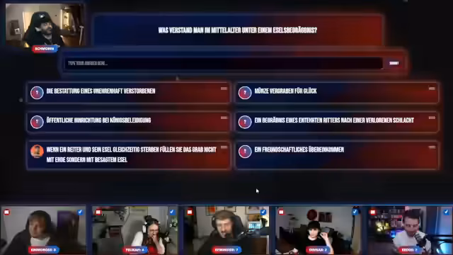 00:34:52Eine weitere Frage zielt auf das mittelalterliche 'Eselsbegräbnis' ab. Hier vermischen sich historische Vermutungen, wie die Bestattung eines unehrenhaft Verstorbenen, mit absurden, selbst erfundenen Familiengeschichten. Ein Teilnehmer behauptet beispielsweise, sein Großonkel sei ein Esel gewesen und ein anderer, sein Vorfahre habe auf einem Komodowaran in eine Schlacht gezogen. Die richtige Antwort ist die Bestattung eines unehrenhaft Verstorbenen.
