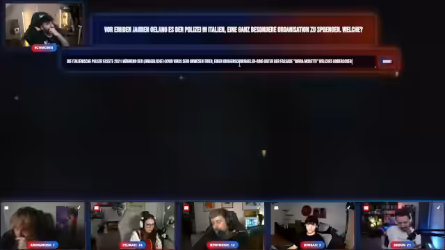 01:17:50Es wird ein Quiz gestartet, bei dem die Teilnehmer raten müssen, welche Organisation die Polizei in Italien gesprengt hat. Die genannten Vorschläge aus dem Chat sind reine Spinnereien wie ein Call-Girl-Ring, dem ausschließlich Großmütter angehörten, ein Drogenschmuggler-Ring unter dem Deckmantel von Birra Moretti und die Drangheta-Mafia. Es werden verschiedene falsche Antworten diskutiert, bis die korrekte Ministerpräsidentin Italiens, Georgia Meloni, als richtig erkannt wird.