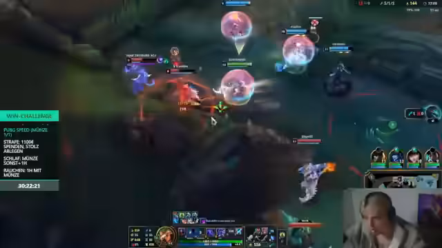 20:26:47Streamer kritisiert einen Mitspieler, der 'I don't care the wave' schreibt, als 'gestört' und schlecht. Er beobachtet, dass Gegner unnötige Fights suchen, während sein Team keine Map-Kontrolle hat. Er äußert die These, dass Spieler nicht mehr zum gewinnen, sondern nur noch zum Schaden spielen. Der Verlust einer Münze wird bedauert.