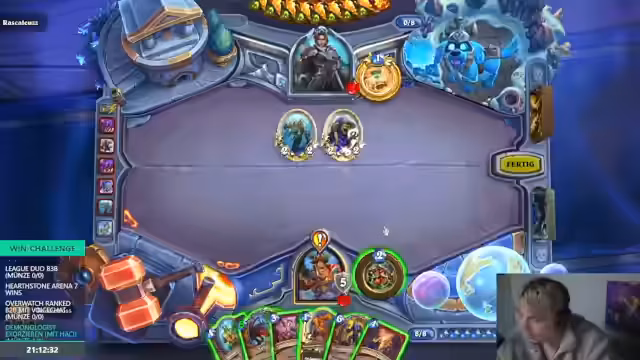 00:10:57Der Streamer kündigt den Beginn der SPONTAN WIN CHALLENGE an und listet die anstehenden Challenges auf, darunter mehrere Overwatch 2 Ranked-Partien, ein League of Legends Back-to-Back und ein Hearthstone Arena-Run mit dem Ziel, sieben Siege zu erreichen. Mit nur 24 Stunden Zeit startet er in den ersten Hearthstone Arena-Run, bei dem er ein ungewöhnliches, starkes Deck des Gegners beobachtet, das ihm im weiteren Verlauf erhebliche Schwierigkeiten bereitet.