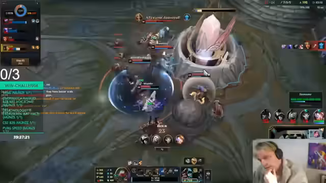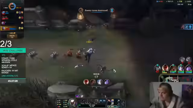 11:34:30Die Herausforderung gewinnt an Fahrt, als Kills auf der Borderline-Lane kontrolliert werden können, was den Gegner seinen Auto-Push verlieren lässt. Nach einem verlorenen Spiel wird der Streamer zum Support und erlebt einen turbulenten Kampf, bei dem der ADC stark ist, aber das Team Schwächen zeigt. Das Spiel endet trotz Bemühungen unglücklich.