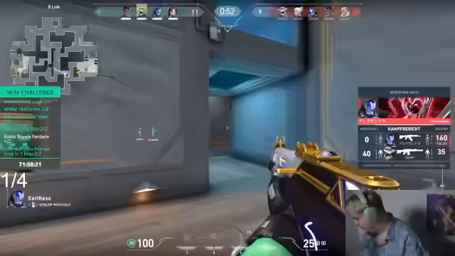 05:51:59Die Nachmittagsspiele sind geprägt von hohem Tempo und hektischem Gameplay. Das kommuniziert intensiv über Team-Chat und versucht, durch koordinierte Pushes und den gezielten Einsatz von Fähigkeiten wie Breach-Ultimativen die Spike zu platzieren. Jede Runde ist ein Kampf um Informationsvorsprung und Map-Kontrolle. Der Stream endet abrupt, nachdem der Streamer an seinem PC einen kritischen Fehler erleidet, der zu einem Freeze und einem kompletten Systemabsturz führt, was das Match sofort beendet und eine Fortführung des Streams unmöglich macht.