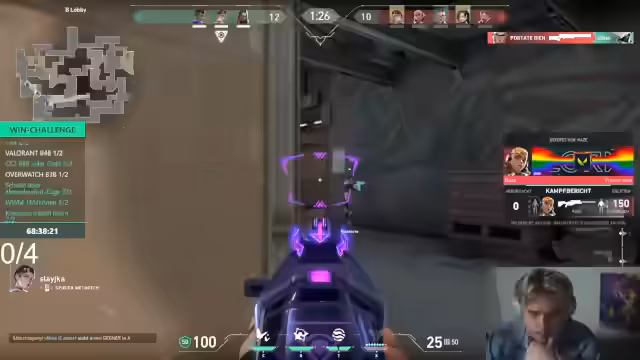 00:29:26Nach der Verzögerung beim Zusammens des Teams beginnt das Valorant-Spiel. Ein Teilnehmer erwähnt, dass er seit anderthalb Jahren nicht mehr gespielt hat, und es kommt zu humorvollen Kommentaren im Chat über die Elo der Mitspieler und die Annahme, dass das Team sich in der Rangliste nach oben spielen wird. Der Streamer betont, dass die Challenge ein mentaler Zerfall ist und fordert das Team auf, sich auf den Kampf einzustellen. Die Kommunikation während des Warm-ups ist von Fehlern und unklaren Anweisungen geprägt, was erste Frustrationen aufkommen lässt.