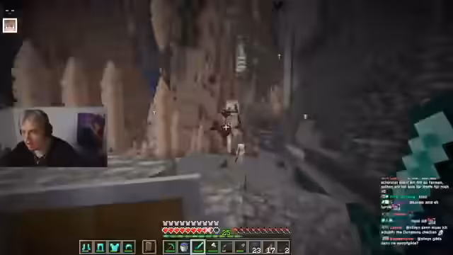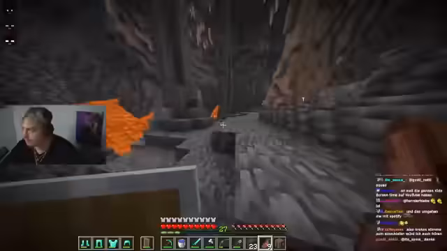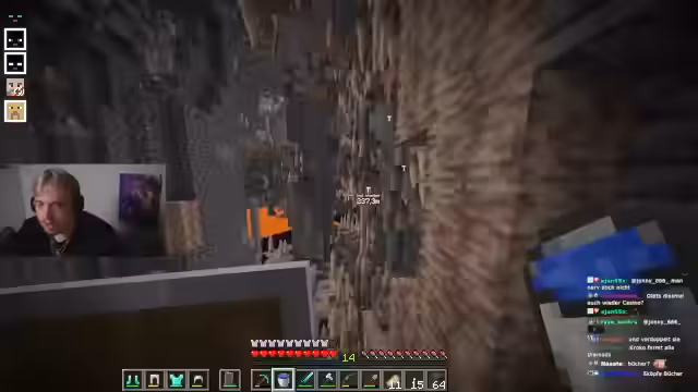 03:55:30Der Streamer erkundet eine tiefe Höhle mit einem markanten Krater, der bis auf Höhe 57 reicht. Er berichtet von dichten Diamantenfunden an den Wänden und zeigt sich begeistert von den Ressourcen. Dabei erwähnt er die Notwendigkeit einer Diamantspitzhacke für Obsidian-Abbau für einen Verzauberungstisch. Ein kurzes Verirren im Tunnelsystem wird beschrieben, bevor er den Weg zurück zur Leiter findet und einen Waypoint setzt, um die Position zu markieren. Die Höhle wird als ergiebiges Gebiet mit Eisen- und Diamantvorkommen charakterisiert.