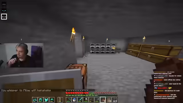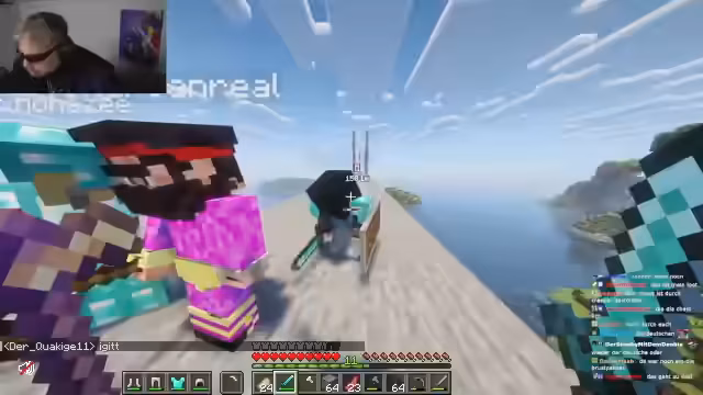02:28:29Die Basis ist nach Stunden nur unvollständig, mit Lavawänden als Hauptproblem. Kritik am unorganisierten Teamplay wird laut – ein Spieler bemerkt, dass nach 5,5 Stunden Minecraft keine funktionierende Infrastruktur existiert. Es folgen Vorwürfe absichtlicher Sabotage ('Griefing') unter Teammitgliedern. Gleichzeitig werden externe Kooperationen erwogen, etwa mit der Gruppe um Josef, um Dorfstrukturen zu bauen, wobei Wetten auf Diamanten als Anreiz dienen sollen.