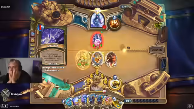 10:00:00Der Fokus wechselt zu Hearthstone. Der Streamer öffnet Packs und erhält Legendary-Karten sowie Tree Lover als neuen Inhalt. Es folgt ein Kartenspiel gegen Paul, bei dem Decks und Strategien verglichen werden. Diskussionen über Karten wie Swain und Rabadon entstehen. Der Streamer bemerkt Unterschiede im Powerlevel der Decks und kommentiert die Zugewinnchancen. Ein möglicher Sieg wird trotz schlechterer Handmöglichkeiten diskutiert.