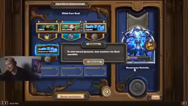 10:01:28Der Streamer berichtet von einem vielleicht besten Tag, bestehend aus ausreichend Schlaf, einem Sieg im Hamburger Derby und einem Powernap. Anschließend startet er eine Hearthstone-Session gegen Philipp. Er kommentiert das Match-Up und seine eigenen und gegnerischen Karten, wobei er sich über sein Glück und die Stärke seines Decks freut.