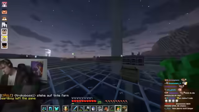 02:04:38Während des nächtlichen Streams wird die laufende Tintenfischfarm analysiert und deren Effizienz in Frage gestellt. Es wird festgestellt, dass zu viel Wasser in der Umgebung spawnen lässt, was dazu führt, dass viele Tintenfische außerhalb der Farm erscheinen. Der Streamer schlägt eine bessere Platzierung des AFK-Spots und die Verwendung einer größeren Farm vor, um die Spawn-Rate zu erhöhen. Gleichzeitig kämpft das Team mit akuten Ressourcenengpässen, insbesondere bei Holz und Eisen, was den weiteren Fortschritt behindert und den Aufbau der Farm erschwert.