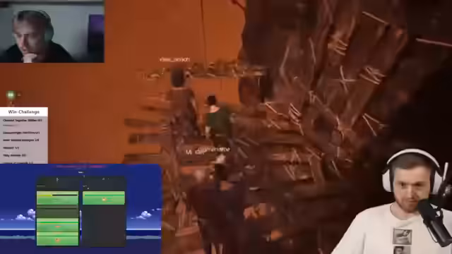 03:27:34Die Streamer spielen ein Jump 'n Run-Spiel und müssen koordiniert über verschiedene Hindernisse springen. Es geht darum, die Sprünge zu meistern und sich gegenseitig hochzuziehen. Sie haben Schwierigkeiten beim ersten Sprung und müssen neu starten. Die Kommunikation ist intensiv, mit vielen Anweisungen wie 'rechts, rechts, rechts' und 'geduldig bleiben'.
