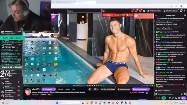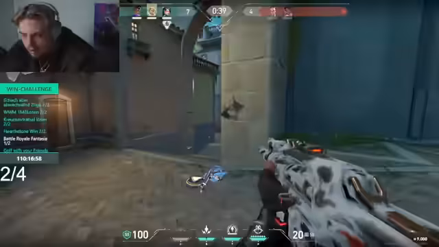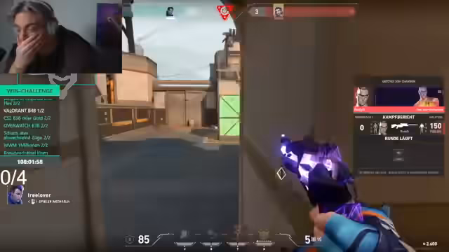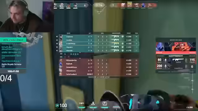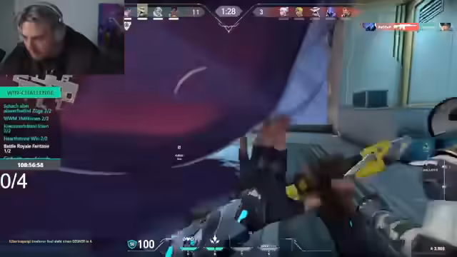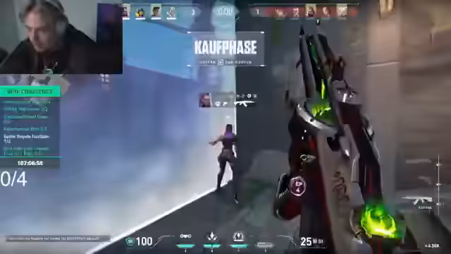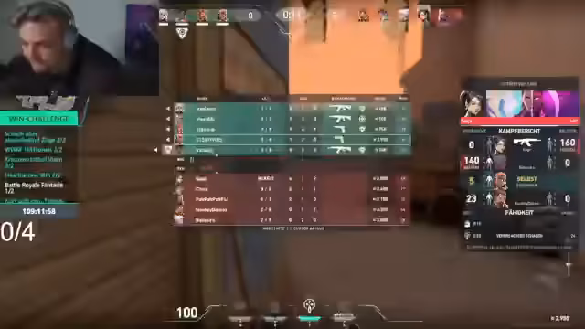 04:05:56Das Gameplay wird noch teamorientierter. Der Streamer koordiniert complexe Manöver, bei denen sich Teammitglieder an verschiedenen Kartenpositionen aufhalten, um gegnerische Spieler einzukreisen. Er nutzt seine Fähigkeiten strategisch, um Flanken abzusichern und teambasierte Angriffe zu initiieren: 'Ich spring zuerst, warte Moss. Drei, zwei, eins.' und 'Wir gehen zu viert Richtung B.'.