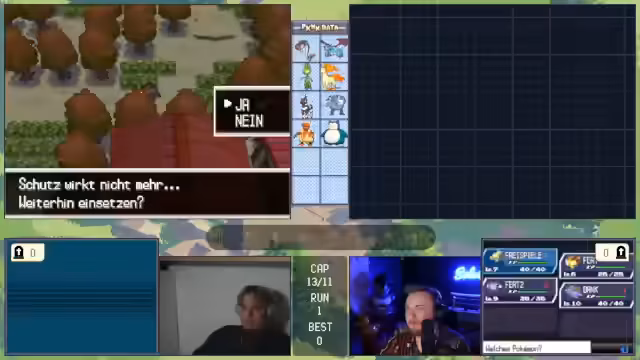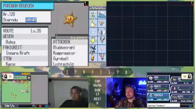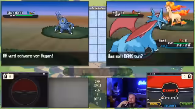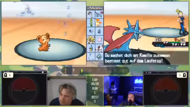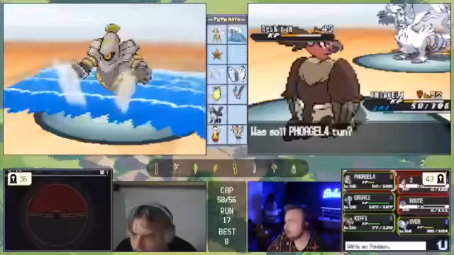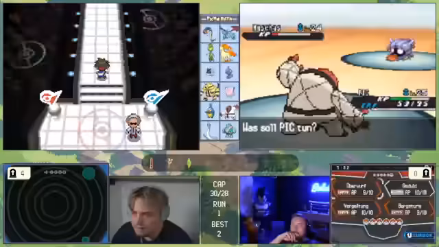00:11:53Die Konversation wechselt zu einem laufenden Pokémon-Spiel, bei dem der Streamer und seine Mitspieler, Basti und Matze, einen schwierigen Run absolvieren. Das Team besteht aus Pokémon wie Magnaion, Bibor und Ampharos. Der Fokus liegt auf der Analyse der Kampfsituationen und den Entscheidungen der Trainer, insbesondere von Matze, der unter starker emotion Belastung steht. Die Stimmung im Team ist angespannt, was zu strategischen Fehlern wie dem unbedachten Einsatz einer Aquawelle führt, die den Verlust eines wichtigen Pokémon zur Folge hat.