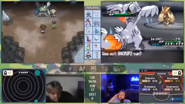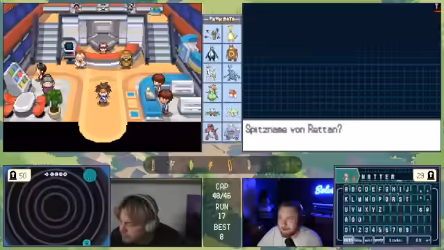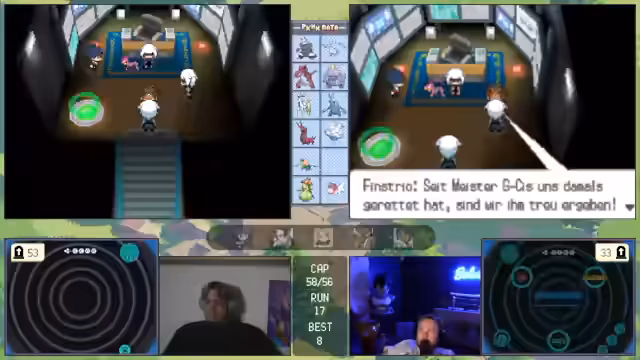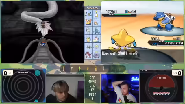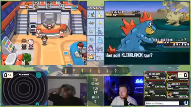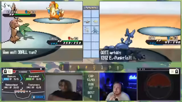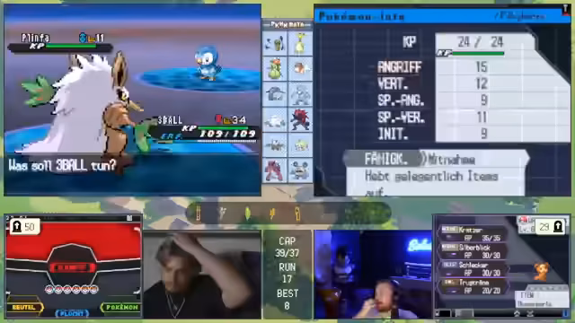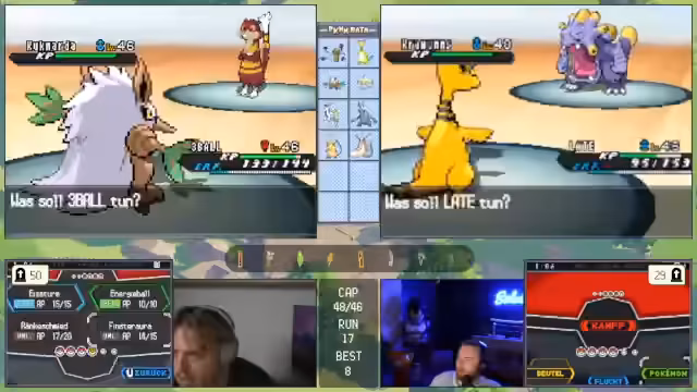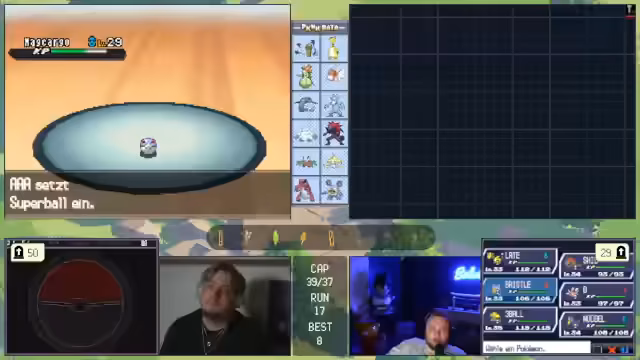 11:00:11Die zuvor geplante Strategie ist gescheitert, was den Streamer verärgert. Das Team gilt nun als 'vernübelt' und ohne klare Gegenmaßnahmen. Es wird über verzweifelte Lösungen gesprochen, wie das Fangen eines starken Gegners mit dem letzten 'Meisterball', um den Run retten zu können.