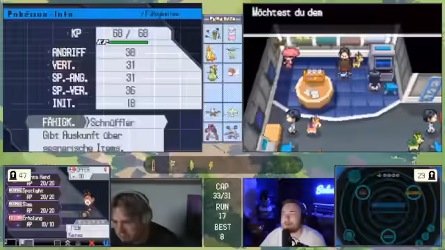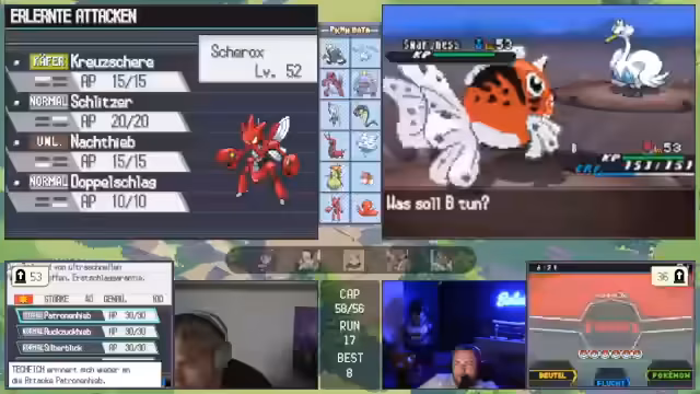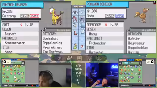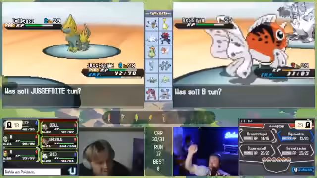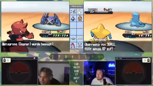 00:28:54Das Gameplay wird durch eine Reihe anspruchsvoller Kämpfe geprägt, die komplexe taktische Entscheidungen erfordern. In einem Kampf gegen ein Rotom mit Rasenmäher und Donnerwelle muss ein schlafendes Pokémon aufgeweckt werden, während gleichzeitig die Paralyse des Gegners genutzt wird. Später kämpft das Team gegen ein stählernes Pokémon, das durch resistente Attacken und hohe Verteidigung eine massive Herausforderung darstellt. Der Streamer opfert gezielt Pokémon, um den Gegner zu schwächen und nutzt Items wie Schutzschild, um Überlebens- und Kill-Chancen zu maximieren.