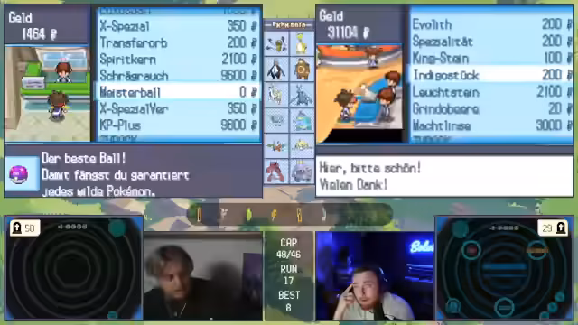 04:43:34Ein Glurak, der Flug und Feuer bietet, wird als extrem stark für das Team angesehen und sofort behalten. Der Streamer sucht nach einem Donnerstein und anderen nützlichen Items wie Herzschuppen und Wasserstein, um seine Pokémon zu optimieren. Die Shops werden als durchgehend schlecht kritisiert, da fast keine wertvollen Items wie Herdstücke zu finden sind. Der Kauf von Bällen wird bedacht, wobei der Streamer überlegt, wie viele er für die Jagt auf benötigte Pokémon investieren soll.