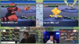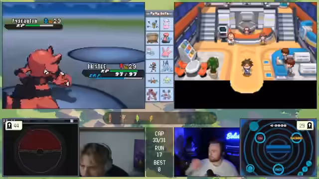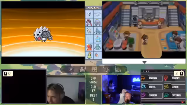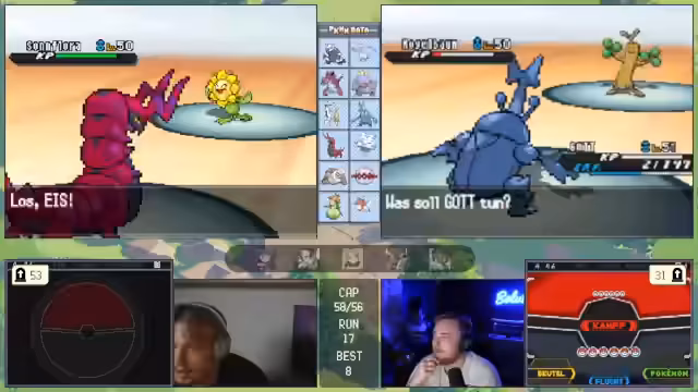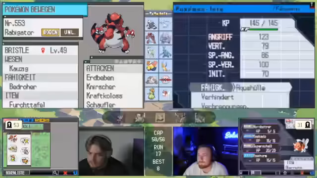 03:50:02Beim Kampf gegen den Rivalen stellt der Streamer fest, dass das Team gut aufgestellt ist. Er versucht, mit Scaraborn und später Bristle durchzugreifen, stößt aber auf Schwierigkeiten, da der Gegner stark verteidigt. Nach dem Kampf ist er mit der Leistung zufrieden, überlegt aber, wie er das Team weiter verbessern kann, insbesondere indem er Bon durch ein passenderes Pokémon ersetzt.