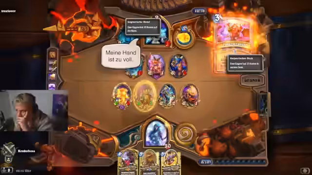 07:00:59Der Streamer startet Hearthstone mit einer Mischung aus Frustration und Trotz. Er kämpft gegen einen Face Hunter, verliert jedoch den ersten Zug und äußert seinen Unmut über das "Gammel Mage"-Deck. In den folgenden Runden wird er von ständigen Topdecks des Gegners gequält, die seine eigenen Pläne durchkreuzen. Besonders ein "Bugabuse" mit einer ungewöhnlichen Angriffsmöglichkeit und ein vermeintlicher glitch verärgern ihn, während er verzweifelt nach einer Wende sucht, die aber nicht eintritt. Das Spiel endet für ihn bitter.