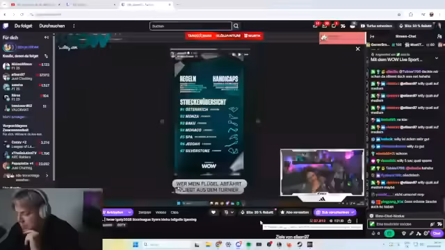 07:34:06Ein Teilnehmer (Maus) gerät stark in die Kritik, da sein Fahrverhalten als "Kamikaze-Fahrer" beschrieben wird. Es wird ein Vorfall erwähnt, bei dem Maus angeblich absichtlich einen Unfall herbeigeführt hat. Dies führt zu Vorwürfen wie "Team Kinderverarsche" und Empörung im Chat. Ein Teilnehmer äußert, dass er ohne dieses Verhalten gewonnen hätte. Die Diskussion dreht sich um Fairness, sportliches Verhalten und die Konsequenzen der Aktionen im Rennen.