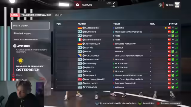 04:00:11Die Regeln werden weiter verfeinert. Willi erhält ebenfalls ein Handicap, das besagt, dass er nur mit dem mittleren Setup im Qualifying fahren darf. Falls dies zu stark ist, soll er auf Platz 18 starten. Die Rennreihenfolge und die Strecken (Österreich, Monza, Baku, Monaco) werden festgelegt und die Renndauer pro Strecke wird bekannt gegeben. Es wird eine Pause nach jedem Rennie eingeplant, da Formel 1 als anstrengend gilt. Der Start des Turniers steht unmittelbar bevor.