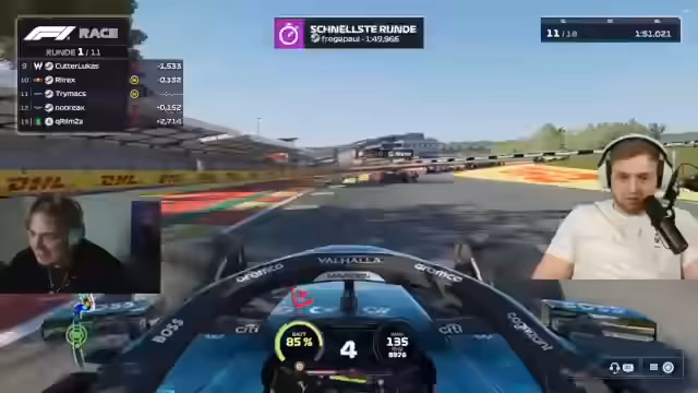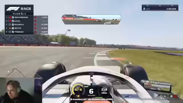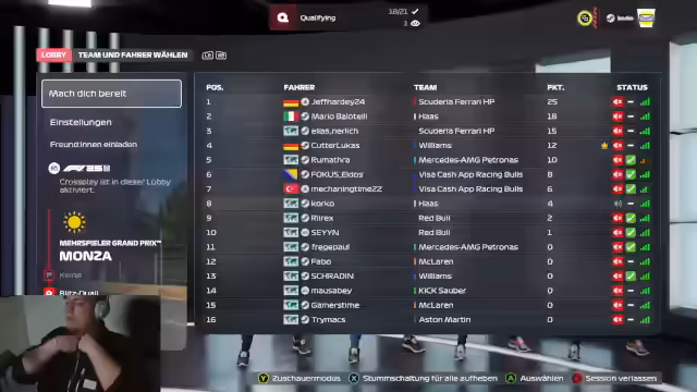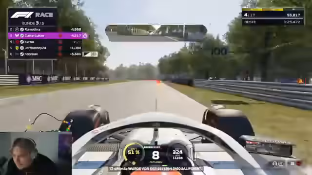 05:07:51Im Finale des Renns in Monza kann der Streamer Max überholen und sich auf den 10. Platz retten, was ihm einen Punkt einbringt. Gleichzeitig gewinnen Paul Frege und Wieland das Rennen. Der Streamer bedauert seine eigene, nicht optimale Leistung, sieht aber ein positives Ergebnis für das Team, da wichtige Punkte gesichert wurden.