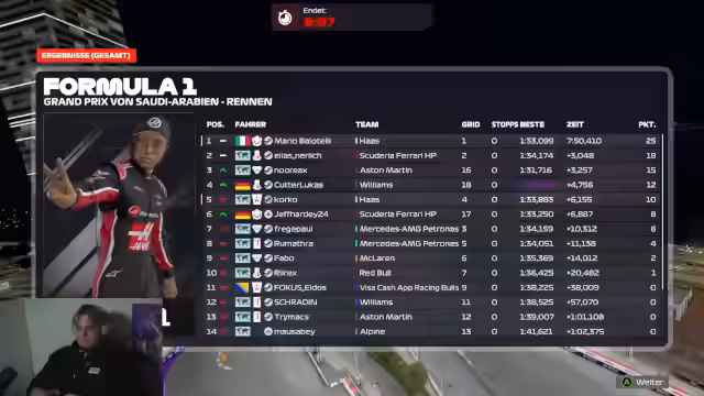 06:53:42Die Gesamtsituation der Team-Wertung wird erneut beleuchtet. Nach dem Rennen in Jeddah ist Team Haas mit 70 Punkten auf Platz zwei, nur einen Punkt hinter den führenden Mercedes-Jungs. Der Streamer lobt besonders die konstanten Leistungen von Paul Frege und die 'Lifetime-Performance' von Noriak, der vom letzten Platz auf den dritten aufgestiegen ist. Trotz des Erfolgs gibt es internes Zoff, insbesondere zwischen Paul Frege und Sascha Hellinger, wegen einer angeblichen Sabotage, die die Stimmung trübt, aber vom Streamer als 'quid' und 'fair' abgetan wird.
