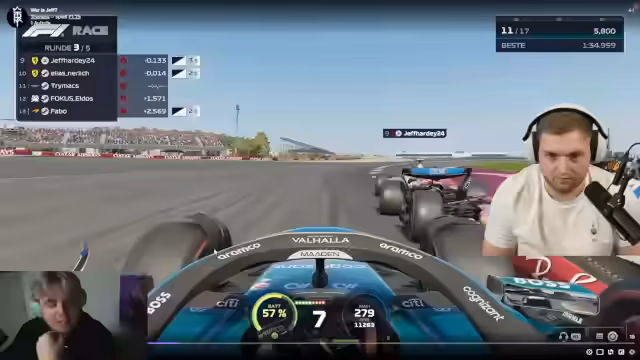 04:52:34Der Streamer berichtet von einem chaotischen Rennstart, bei dem er selbst von Schradin gedreht wird. Es kommt zu mehreren Kollisionen und Ausfällen in der ersten Runde. Max und Frege werden gelobt, während der Streamer den unfairen Fahrstil von Schradin kritisiert, der ihm ebenfalls Schaden zufügt. Die Renndynamik wird als sehr aggressiv und unkontrollierbar beschrieben, was den Streamer frustriert.