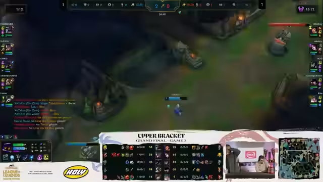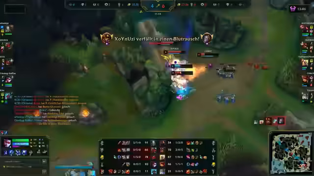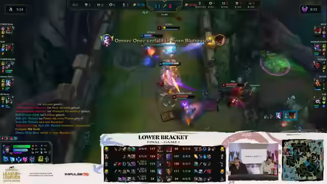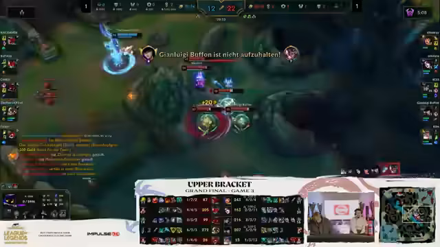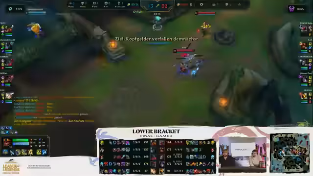 01:13:45Die Stimmung im Team von Grimms Märchen heizt sich weiter auf, insbesondere beim Commander, der mit der Leistung seines Teams unzufrieden ist und 'wie eine Tomate' dampft. Es wird ein größerer Impact vom Nocturne des Junglers gefordert. Chef Strobl, der weiterhin auf der Toplane splitpusht, macht einen Fehler, der zu seinem Tod führt. Trotzdem erzielt er Gold, kann aber im Teamfight nicht viel ausrichten. Ein Teamfight bricht aus, bei dem Schuld und Sühne die Oberhand gewinnt, auch ohne die Anwesenheit von Kuba. Rumatra, der ADC von Schuld und Sühne, zeigt eine starke Performance und erzielt einen deutlichen Goldvorteil. Ein Replay zeigt einen unglücklichen Solo-Kill von Kuba gegen Chef Strobl, bei dem Kuba Fehler macht. Xio, der Jungler von Schuld und Sühne, versmitet einen Drake, was auf Nervosität hindeutet. Der Commander von Grimms Märchen hat bereits drei Full-Items, obwohl seine Lane schlecht lief und er viele Carni-Uls kassierte.