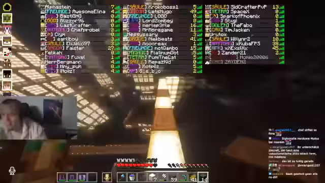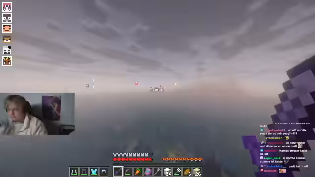 03:59:00Der Streamer erlebt technische Probleme mit dem Stream und ist frustriert über die Situation im End. Es wird berichtet, dass Basti bereits fünf Elytren besitzt, während der Streamer selbst noch auf der Suche ist. Die Gefahr durch Endermen wird thematisiert, da diese scheinbar stärker geworden sind und den Streamer fast getötet hätten. Er hat sein Totem verloren und ist gezwungen, sich zurückzuziehen. Die Suche nach Elytren und Shulker-Kisten gestaltet sich schwierig, da keine Cities oder Schiffe gefunden werden und die Renderdistanz problematisch ist. Es wird diskutiert, dass man am besten in eine Himmelsrichtung fliegen sollte, um die Chancen auf Cities zu erhöhen. Der ineffiziente Tag im End wird beklagt und es wird dazu aufgerufen, alle Kräfte zu mobilisieren.
