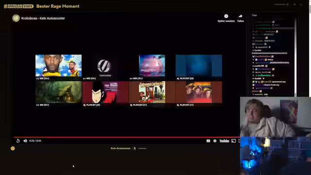 00:50:13Kroko und Nikbit versuchen, die Stream Awards gemeinsam zu verfolgen und abzustimmen, stoßen jedoch auf technische Schwierigkeiten mit der 'Vote Together'-Funktion, die nicht wie erwartet funktioniert. Sie experimentieren mit OBS Ninja, um ihre Facecams gleichzeitig anzuzeigen, müssen aber schließlich auf eine Discord-Übertragung ausweichen, um die Clips ohne Unterbrechungen und technische Probleme zu zeigen. Sie beginnen mit der Kategorie 'Bester Rage-Moment' und schauen sich den Clip von 'Hardy-Blau-Rot-Band' an, den Nikbit als 'schrecklich' empfindet, aber als sehr gültig anerkennt. Anschließend sehen sie Krokos eigenen Rage-Clip von einem Autoscooter-Turnier, bei dem es um viel Geld ging und die Emotionen hochkochten. Kroko gibt zu, dass es ein 'OOC-Rage' war, was Nikbit besonders schätzt. Ein weiterer Clip von 'Ello-Trix' wird als klassischer Rage-Moment eingestuft, der immer wieder gut ankommt.