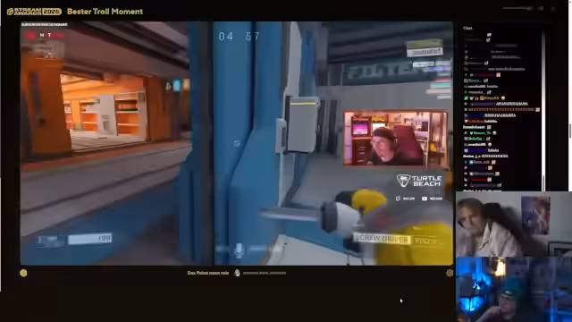 01:46:21Die Kategorie 'Best Awkward Moment' wird eingeläutet, gefolgt von einer kurzen Pinkelpause. Ein Clip, in dem eine Lehrerin mit ihrer Schulklasse beim Essen von Kevin und Reese erwischt wird, wird als unangenehm empfunden, aber auch aus verschiedenen Perspektiven beleuchtet. Weitere Clips in dieser Kategorie umfassen eine peinliche Situation bei der Frage nach den Vornamen der PietSmiet-Mitglieder und einen wütenden Besucher auf dem Oktoberfest. Die Diskussionen über diese Momente sind humorvoll und teilweise schockiert über die Peinlichkeit der Situationen. Anschließend wird die Kategorie 'Beste Zuschauer-Interaktion' behandelt, wobei ein Clip von Hand of Blood, der einen neuen Freund findet, besonders gut ankommt und als 'geil' und 'insane' beschrieben wird.