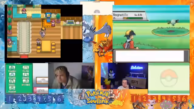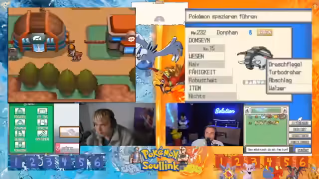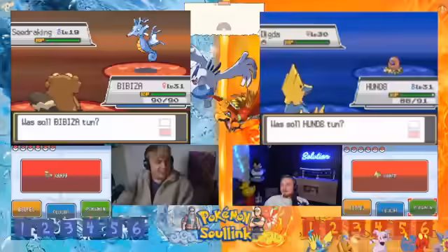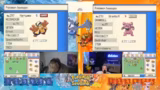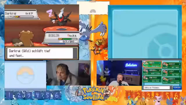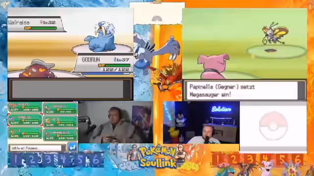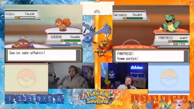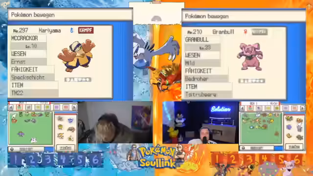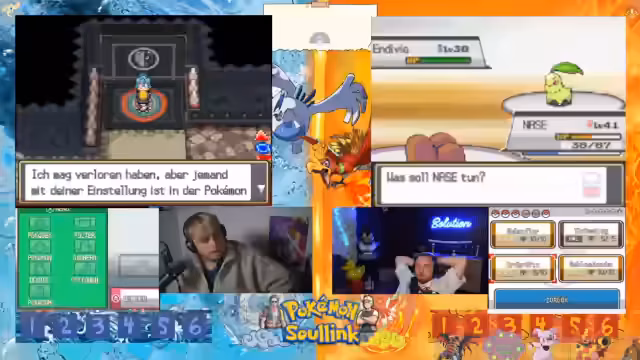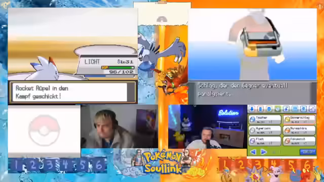05:13:12Das 2v2 Rennen beginnt mit dem Einmarsch in das Feld. Die Streamer sind bereit, ihre bereits vollgelevelten Pokémon mit vollem Leben ins Rennen zu schicken. Es kommt zu einem ersten Tausch, wobei das gegnerische Team mit einem Hirachi startet, das über Stahlpyscho und Schwebe verfügt. Ein erster Angriff wird ausgeführt, der jedoch resistet und dem eigenen Pokémon Rückschaden zufügt, was zu einer frühen strategischen Verzweiflung führt.