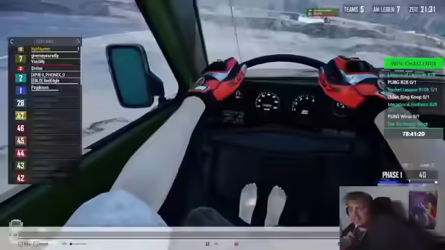 12:28:28Ein Helikopter mit einer Person am Seil wird gesichtet, was zu Spekulationen über ein Notfall-Pickup führt. Der Streamer beschließt, den Helikopter anzuvisieren. Ein Auto nähert sich und wird beschossen. Es wird über die Menge an Energy Drinks eines Gegners und einen gefundenen Geheimschlüssel diskutiert. Ein besiegter Gegner hatte Dreierrüstung und wurde mit einer 19-Schuss-Vektor besiegt. Es wird kurz über die Reparatur von Ausrüstung gesprochen, bevor der Streamer seine 14 Energydrinks konsumiert, da er noch keinen Magna gefunden hat. Die Gruppe fährt in Richtung Zone, wobei sich Gegner in der Nähe befinden.