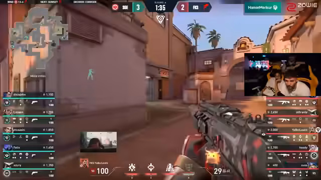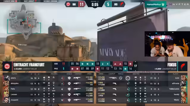 01:59:22Bei einem 12:12 steht das Spiel offen. Der Kommentator betont die Wichtigkeit der Pistolenrunde und das 'Curse'-Phänomen, bei dem der Verlierer der Pistolenrunde oft auch das gesamte Match verliert. SGE bleibt konsequent und verschafft sich Vorteile durch bessere Entscheidungen und executions, was den Unterschied macht.