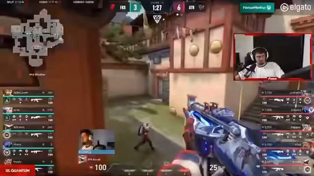 01:49:11Die letzte Map Haven beginnt dramatisch. Fokus startet mit einem perfekten Pistolenrunde-Sieg. Überraschend spielt diesmal nicht Xass seine gewohnte Jett-Rolle, während der Gegner ATN auf den viel gescholtenen Spieler Laka setzt. Kommentator und Chat sind perplex über diese ungewöhnlichen Pick-Entscheidungen.