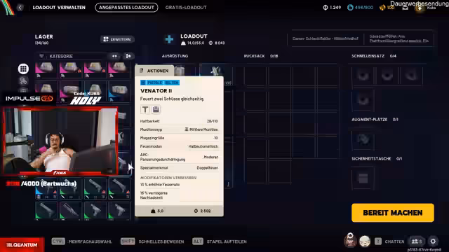 05:22:08Der Streamer ist mit seiner Ausrüstung unzufrieden und kritisiert Waffen wie die Anvil. Nach einem frustrierenden Rundenende aufgrund eines Turrettreffers, das ihn wütend machte, konzentriert er sich auf das Sammeln von Ressourcen. Er betont die Notwendigkeit, Rauchgranaten und Defibrillatoren zu craften, und entscheidet, um Platz im Inventar zu schaffen, Waffen wie die Osprey und Bettina zu verkaufen, um den Lagerraum zu erweitern. Er plant auch, entspanntere Runden zum Sammeln von Chemikalien und Metallteilen zu spielen, um sich für zukünftige Kämpfe zu wappnen.
