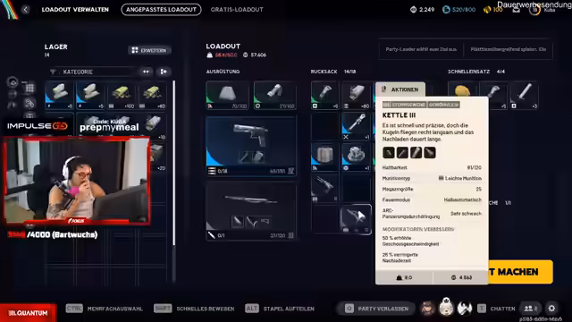 00:56:01Der Streamer entscheidet sich für einen Waffenwechsel und will eine Shotgun ausprobieren, da er seine bisherigen Waffen auf Level 4 als kaputt betrachtet. Er wählt eine als Zweitwaffe, um die verschiedenen Kampfentfernungen abzudecken. Das Gameplay wird dadurch aggressiver und der Ton im Chat sowie vom Streamer selbst schärft sich, was zu einer Eskalation des spielerischen Drills führt.