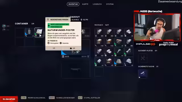 00:29:03Der Streamer kündigt die Start der neuen Season in drei Tagen an. Er erklärt das System der "Vibes", eine freiwillige Aktivität, die mehr Stash-Plätze und Skill-Points belohnt. Die Crew bereitet sich auf eine neue Runde vor und optimiert ihr Inventar. Sie versuchen, effizient zu looten, um im PvP nicht zu überladen zu sein und strategische Vorteile zu haben.