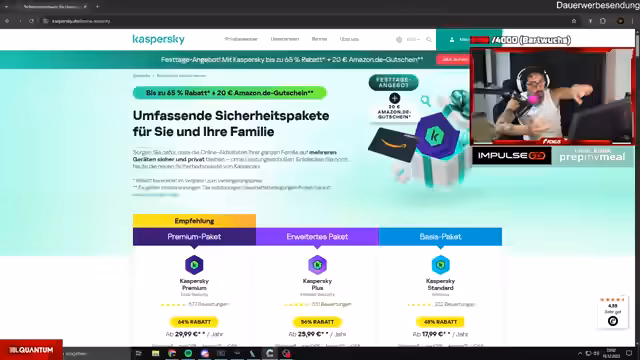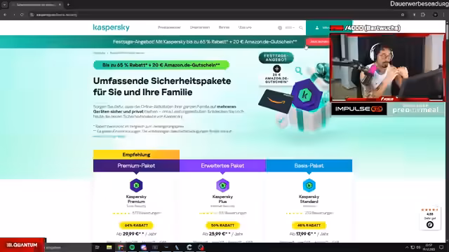 07:33:44Kaspersky wird als offizieller Partner präsentiert. Der Streamer betont die Wichtigkeit des Online-Schutzes, besonders in der Weihnachtszeit beim Einkaufen. Er erklärt, wie Kaspersky Kontodaten, Bankdaten und Twitch-Konten absichert und wirbt mit dem Rabattcode „Social15“ für 15% Preisnachlass auf Sicherheitslösungen.