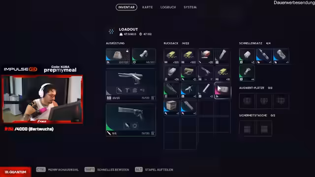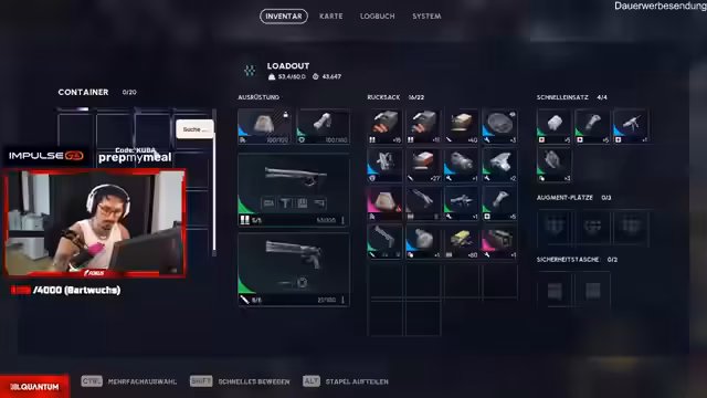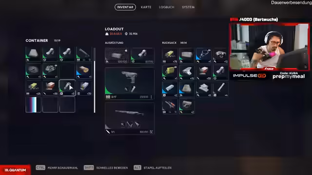 06:28:29Nach einer Unterbrechung kehrt der Spieler zurück und diskutiert die Optimierung seines Inventars. Es folgt eine detaillierte Analyse der mitgeführten Waffen wie der 'Bomber-Cut' und Entscheidungen über Munitionsverteilung. Dabei werden Spielmechaniken wie die Kapazität von 'Arschtaschen' (Sicherheits-Taschen) besprochen. Der Streamer betont, wie wichtig das richtige Loot-Management für das Überleben in nachfolgenden Runden ist. Dies zeigt den Übergang von Kampfhandlungen zur taktischen Vorbereitung.