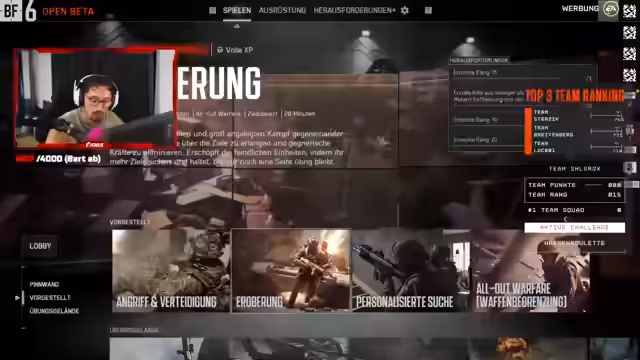 00:00:00Der Streamer begrüßt seine Zuschauer und erwähnt technische Schwierigkeiten bei der Aufnahme. Er kündigt Battlefield 6 für 20 Uhr an und betont, dass es sich um die Open Beta handelt, die bis zum 17. läuft. Der Streamer zeigt sich begeistert über die Möglichkeit, etwas anderes als die üblichen Spiele zu zocken und erwähnt, dass er bereits gute Siege in Battlefield 6 geholt hat.