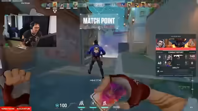 05:26:42Der Streamer befindet sich mitten in einem hochintensiven Valorant-Spiel. Er äußert Frustration über den Verlauf der Runden, beschreibt taktische Fehler seinerseits wie ein falsch platziertes Ultimate ('Das hat mich sauer. One-Tap.') und kritisiert die Entscheidungen seiner Mitspieler ('Die sind alle hier. Überleg, vielleicht überleben wir uns weiter.'). Das Gameplay ist von schnellen, unkoordinierten Aktionen und Missverständnissen innerhalb des Teams geprägt, was zu mehreren Rundenverlusten führt.