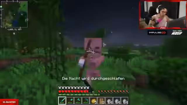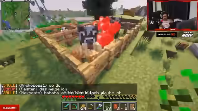 01:02:46Merle konfrontiert den Streamer wegen ihres Pferdes, das er angeblich getötet hat. Er versucht, die Situation zu erklären, indem er Paul und Reapers die Schuld zuschiebt und sich selbst als Opfer der Umstände darstellt. Er bietet Merle an, sich von ihr versklaven zu lassen, um die Schuld zu begleichen. Während der Diskussion wird er von einem Pfeil getroffen, was darauf hindeutet, dass sie belauscht werden. Merle begleitet ihn anschließend auf eine Tour durch seine Villa, wobei sie ihn neckt und versucht, seine Sachen zu nehmen. Es kommt zu einem spielerischen Kampf zwischen den beiden, bei dem der Streamer seine Unerfahrenheit in Minecraft eingesteht, aber dennoch versucht, Merle zu besiegen.