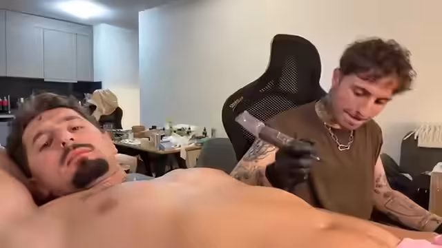 01:01:51Das eigentliche Tätowieren beginnt, nachdem die Platzierung endgültig festgelegt wurde. Der Streamer liegt für den Prozess bequem, fühlt sich dabei aber unwohl und nackt vor der Kamera. Währenddessen interagiert er intensiv mit dem Chat, beantwortet Fragen und lässt die Zuschauer am Geschehen teilhaben. Sein Tätowierer Gianni stellt sich vor und gibt Einblicke in seine Arbeitsweise und Preisgestaltung.