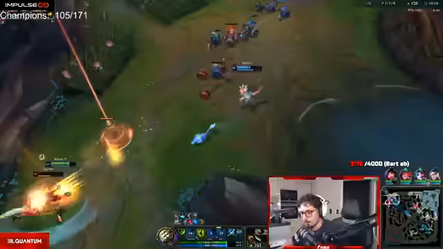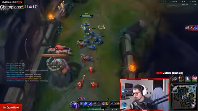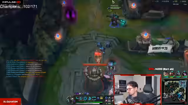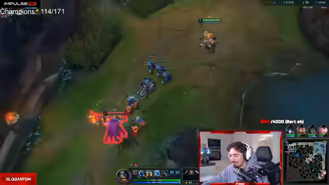 11:13:23Zu Beginn des Streamings dominieren unkoordinierte Aktionen und chaotische Teamfights auf der Top-Lane mit Darius. Der Streamer unternimmt mehrere Vorstöße, scheitert aber häufig und beklagt sich über die mangelnde Wirkung seiner Ultimate-Fähigkeit. Er fordert Zuschauer und Mitspieler auf, aggressiver in den Kampf zu gehen, während sein Mitspieler Kuba auf der Sidelane farmt. Der Fokus liegt auf der Unzufriedenheit mit den getroffenen Entscheidungen und der geringen Wirkung in den anfänglichen Gefechten.