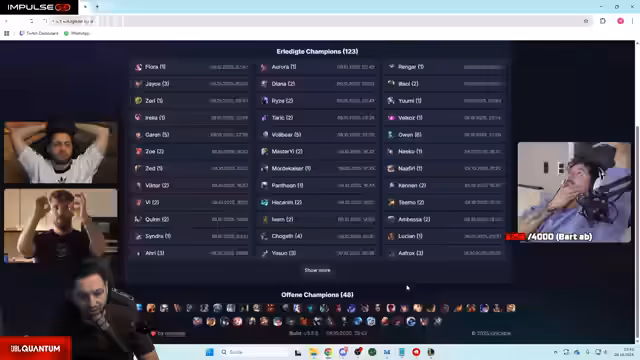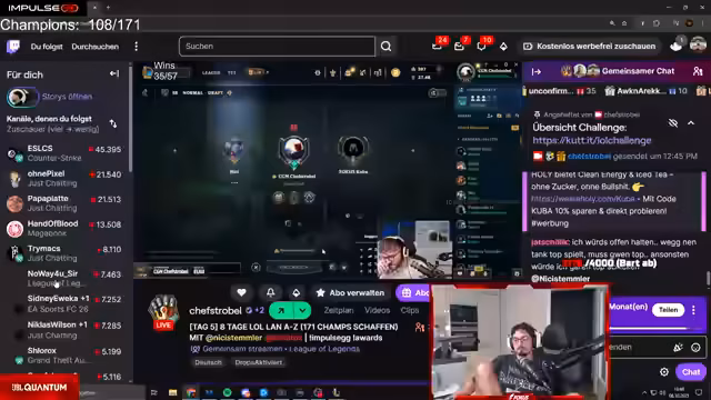 06:15:36Die Streamer geben einen aktuellen Stand ihrer '8 Tage LoL Challenge'. Sie haben 108 von 171 Champions gespielt und benötigen täglich mindestens 8 Siege, um auf Kurs zu bleiben. Trotz des Challenges, bei der sie verschiedene Champions ausprobieren, arbeiten sie eng zusammen, analysieren ihre Spiele und passen ihre Strategien an, wie zum Beispiel die Wahl der Champions und die Platzierung auf der Map, um ihre Erfolgschancen zu maximieren.